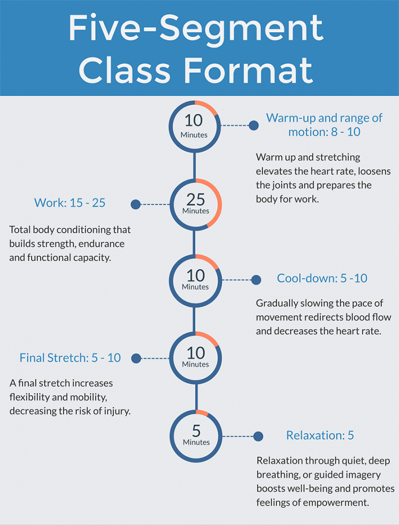 SilverSneakers Classic is a 45- to 60-minute class and uses the signature 5-segment class format. This structure forms the framework to help you teach thoughtful, effective and fun SilverSneakers Classic classes.