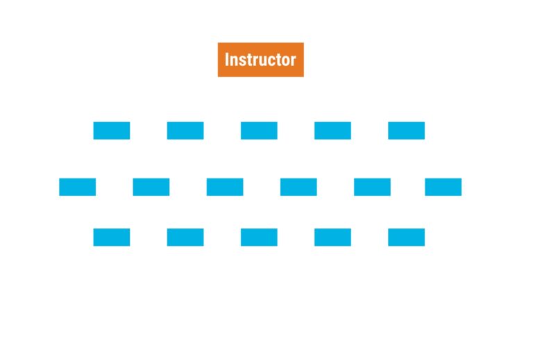 Chairs should be set up in rows, in a honeycomb fashion, making it easy for all participants to see the instructor at the front of class. A good guideline for optimum spacing between chairs is to provide approximately 4′ X 4′, or 16 square feet, for each member of class.