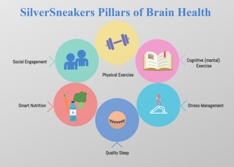 The SilverSneakers Pillars of Brain Health is an all-inclusive approach to improving cognitive function. Lifestyle choices such as regular physical exercise, cognitive (mental) exercise, staying socially engaged, eating a balanced diet, getting quality sleep and working to reduce stress are just some examples of actions we can take to boost brain health. The more each of the Pillars is prioritized in daily life, the longer and stronger the brain will continue to work at its peak.  Thus, slowing or even reducing the risk of cognitive decline.