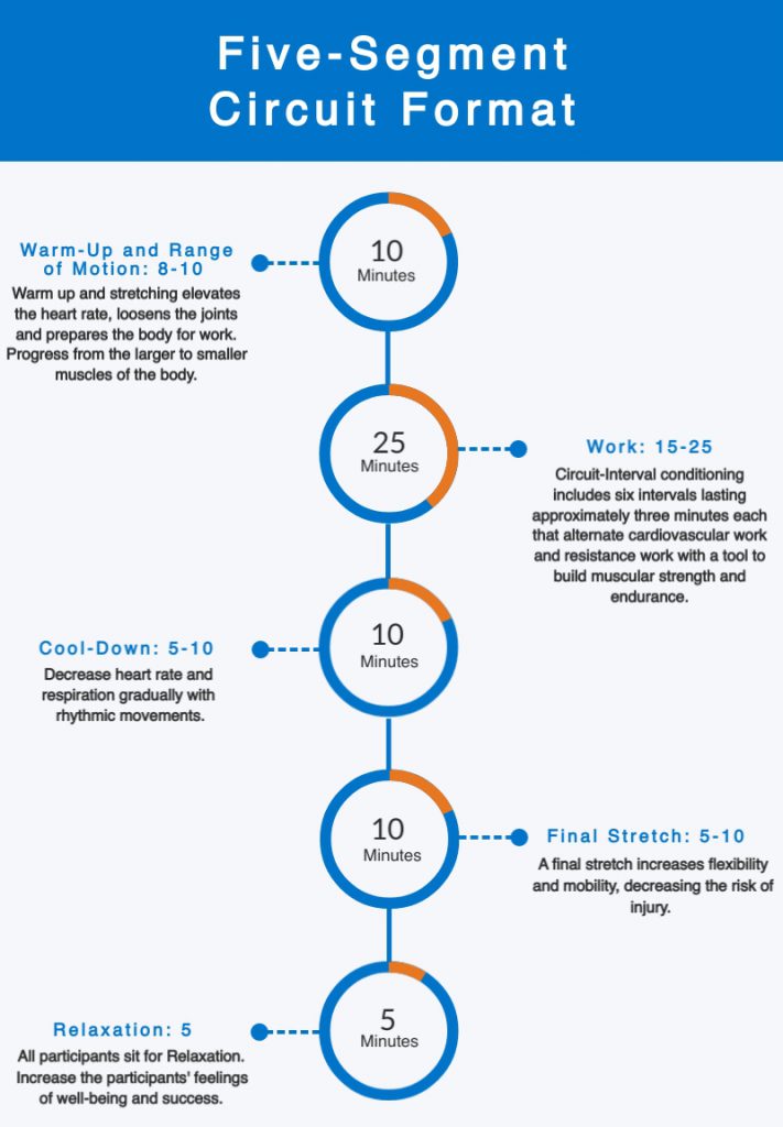 Like all SilverSneakers classes, SilverSneakers Circuit follows a 5-segment format. The class segments are Warm-Up, Work, Cool-Down, Final Stretch and Relaxation.