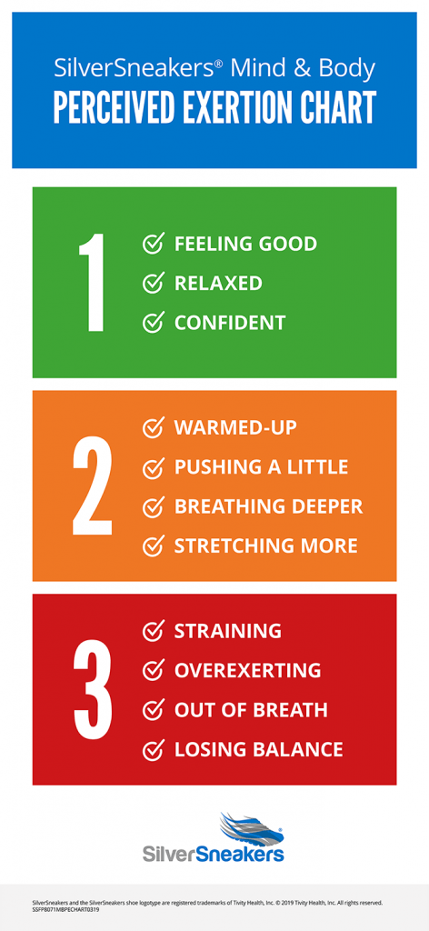 Using the SilverSneakers perceived exertion chart of 1 to 3 for mind-body classes provides reliable feedback from class participants for safety and understanding. Review the chart before every class, even when members “know it.” Establish this habit and the expectation for reliable, accurate feedback in all your SilverSneakers classes.