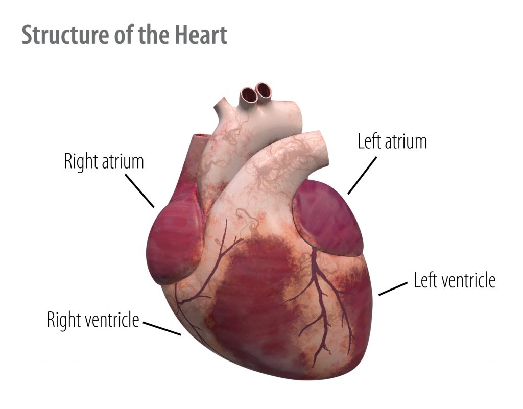 - Composed of four chambers; left and right ventricles, left and right atria.