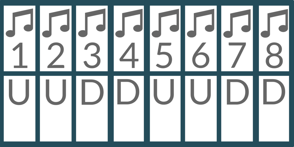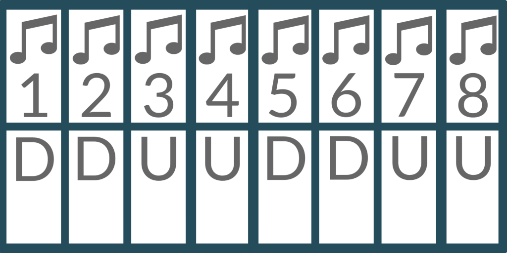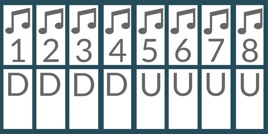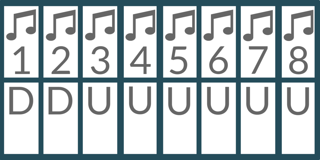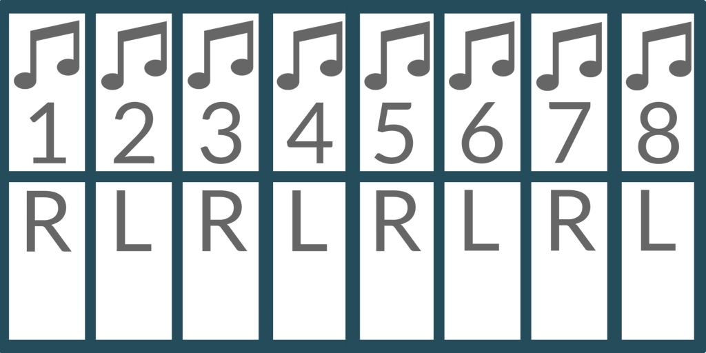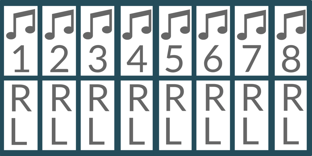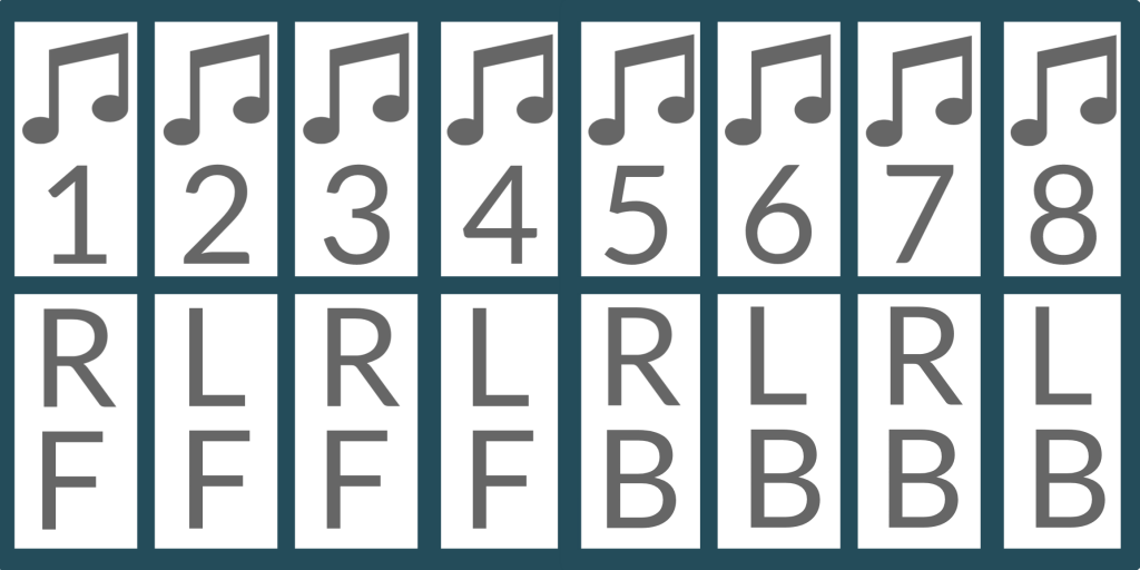 The following boxes provide a visual representation of the movements practiced in the video. The beats of music are numbered 1-8. The key notes the movement that was performed on the specific beat of music for each rhythmic variation.