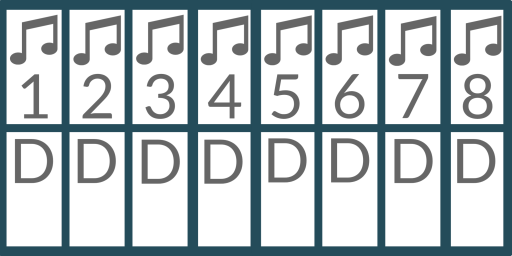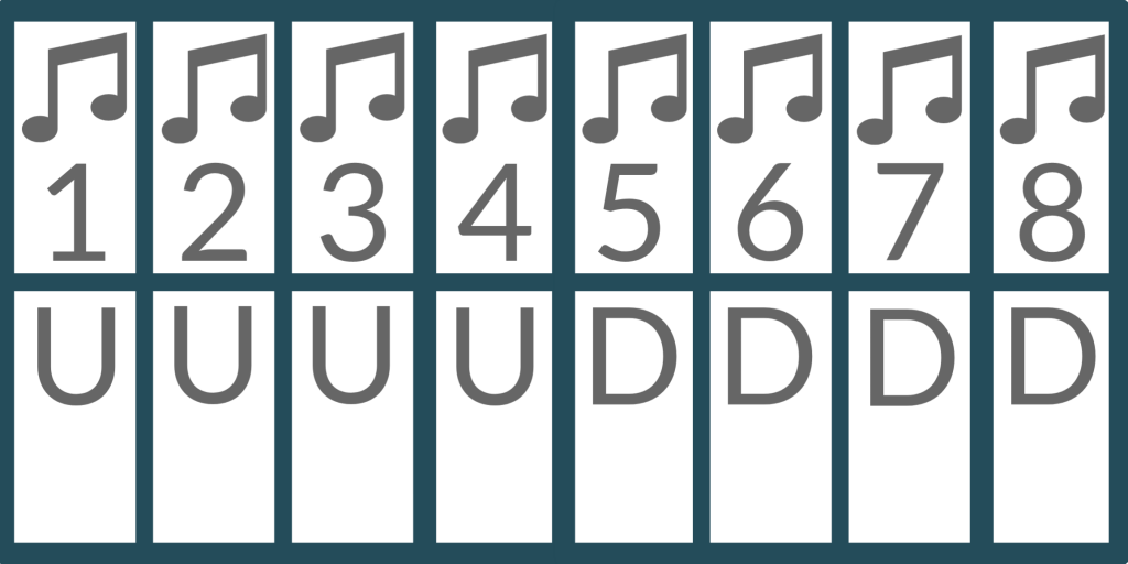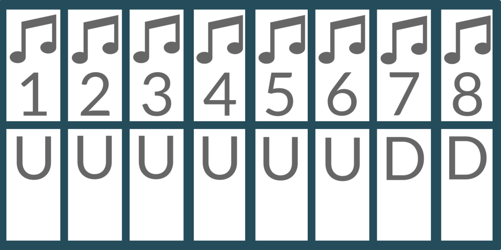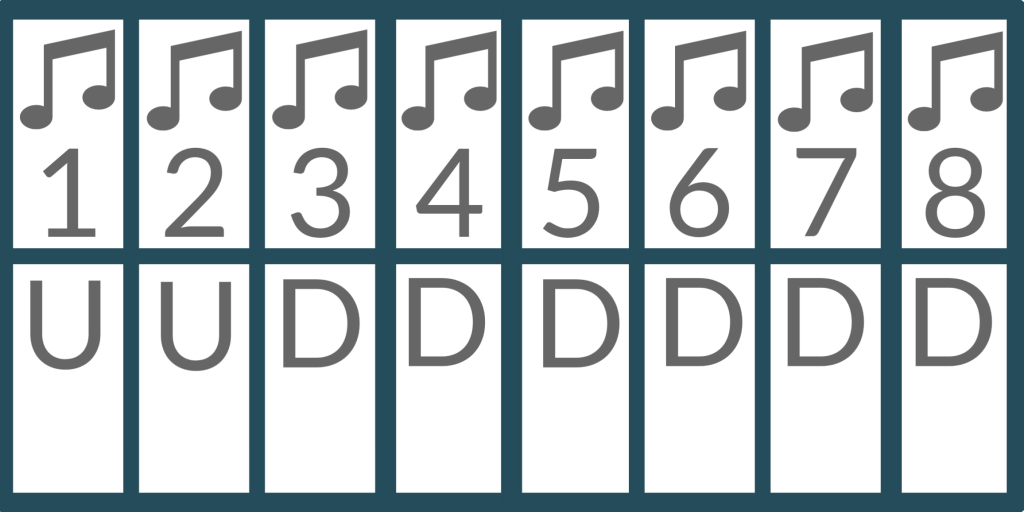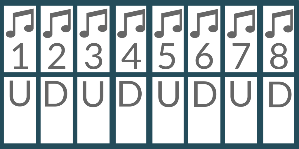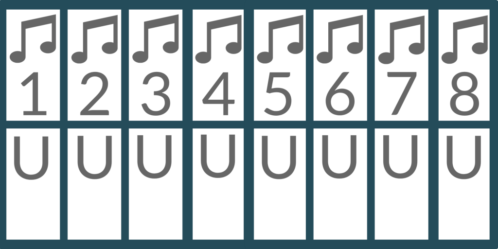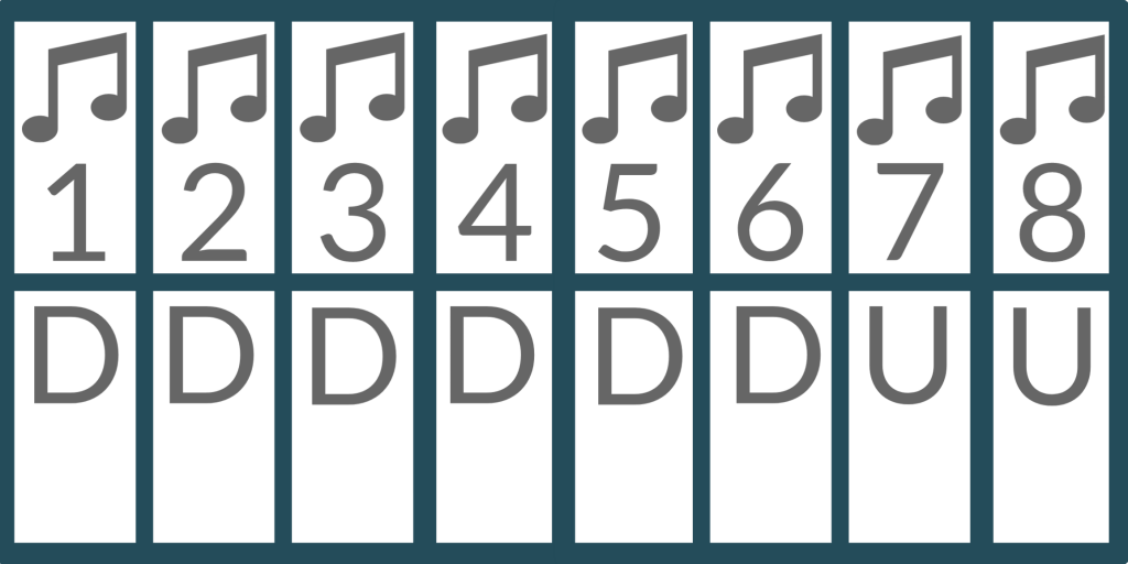 The following boxes provide a visual representation of the movements practiced in the video. The beats of music are numbered 1-8. The key notes the movement that was performed on the specific beat of music for each rhythmic variation.