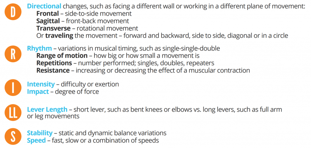 The ACE Group Fitness instructor handbook (2016) uses the acronym DRILLS to help remember such variations.