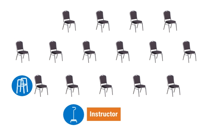 - Walkers, rollator or cane – Recommend that participants place their walker next to the chair. Guide members with walkers to sit on an end if possible, so the walker does not become a tripping hazard for another member. If a participant has a cane, ask “if the cane can be placed at the front of class,” and when class is finished be sure to return the cane for the member.