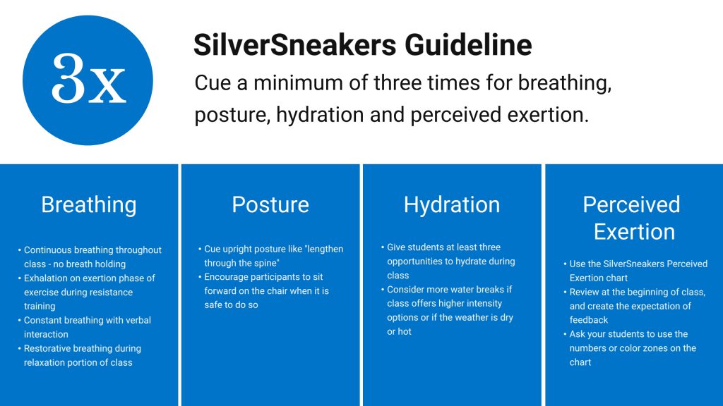 Cueing a minimum of three times for breathing, posture, hydration and perceived exertion provides valuable reminders to participants to enhance safety while exercising.