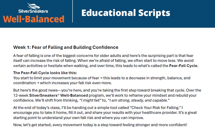 Each week, your SilverSneakers® Well-Balanced class will include a brief educational message focused on one fall prevention topic. The education we provide is designed to spark reflection and conversation, offering practical tools that participants can apply at home or share with family members.