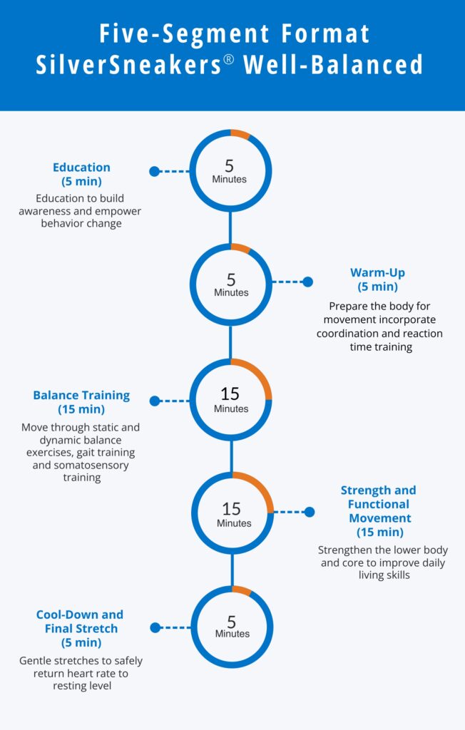 The SilverSneakers® Well-Balanced class is a 45-minute group exercise class designed to address multiple dimensions of movement critical for reducing fall risk: strength, balance, coordination, reaction time, and flexibility/mobility.