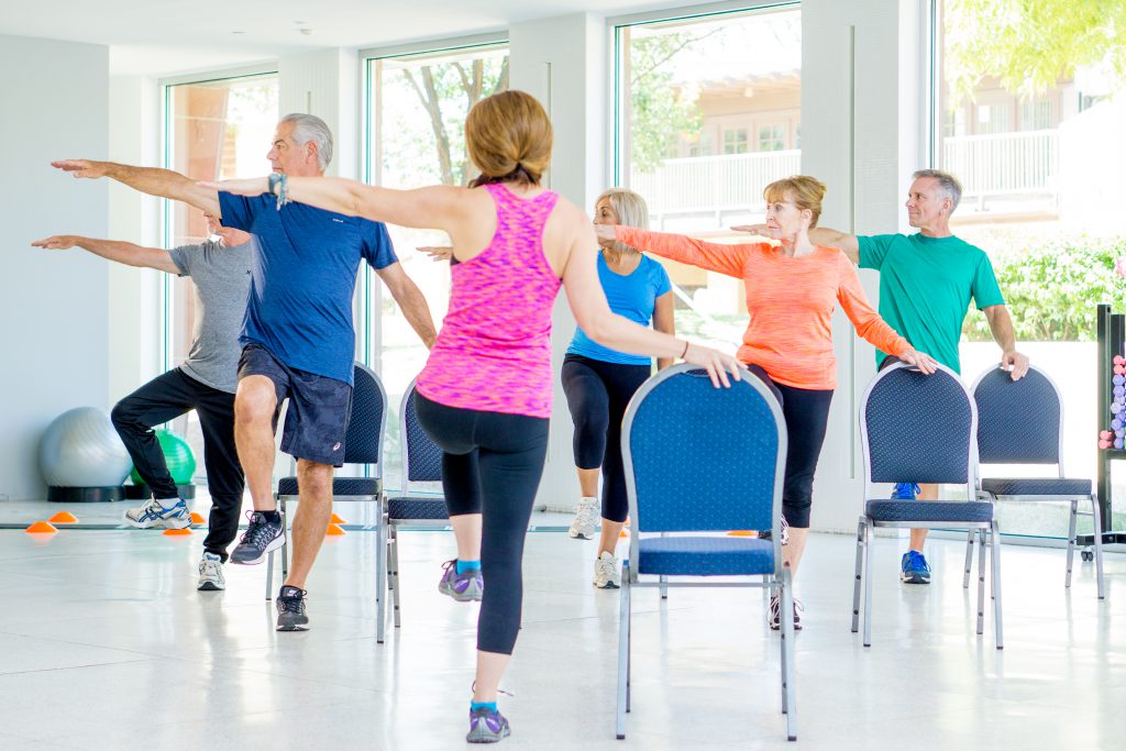 All exercises are done from seated or standing positions using the chair for support. This eliminates the need for floor-based transitions, which can be risky for older adults.